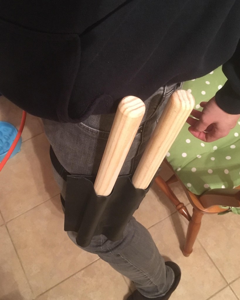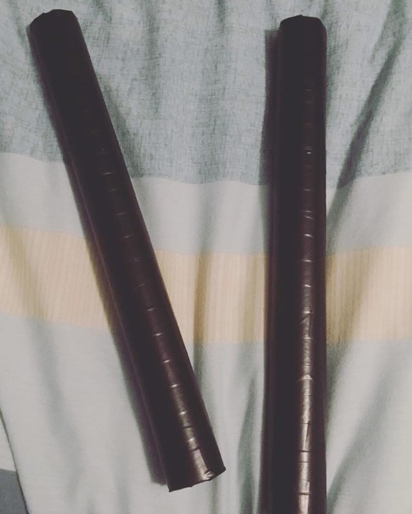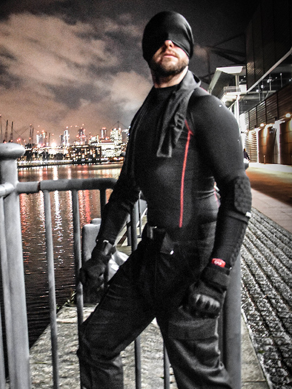 I made a holster, sanded down a broom handle and even made ‘safe’ wooden clubs by wrapping pvc pipes with a wood texture. Prior to the wooden ones I made clubs out of kitchen roll tubes and black electrical tape. For the main costume I managed to source the sporting gear used in the show, including the (lesser known) wrist binders, gloves, hexagonal padding etc. I found lightweight fabric that can block out your face, but does not entirely obstruct your vision (which I used to make the mask) and put it all together. In this cosplay I met Charlie Cox himself, at Wales Comic-Con. I was so star struck, however, that when he asked, “Can you see me, in that mask?” I answered honestly and didn’t make a joke about being Daredevil.