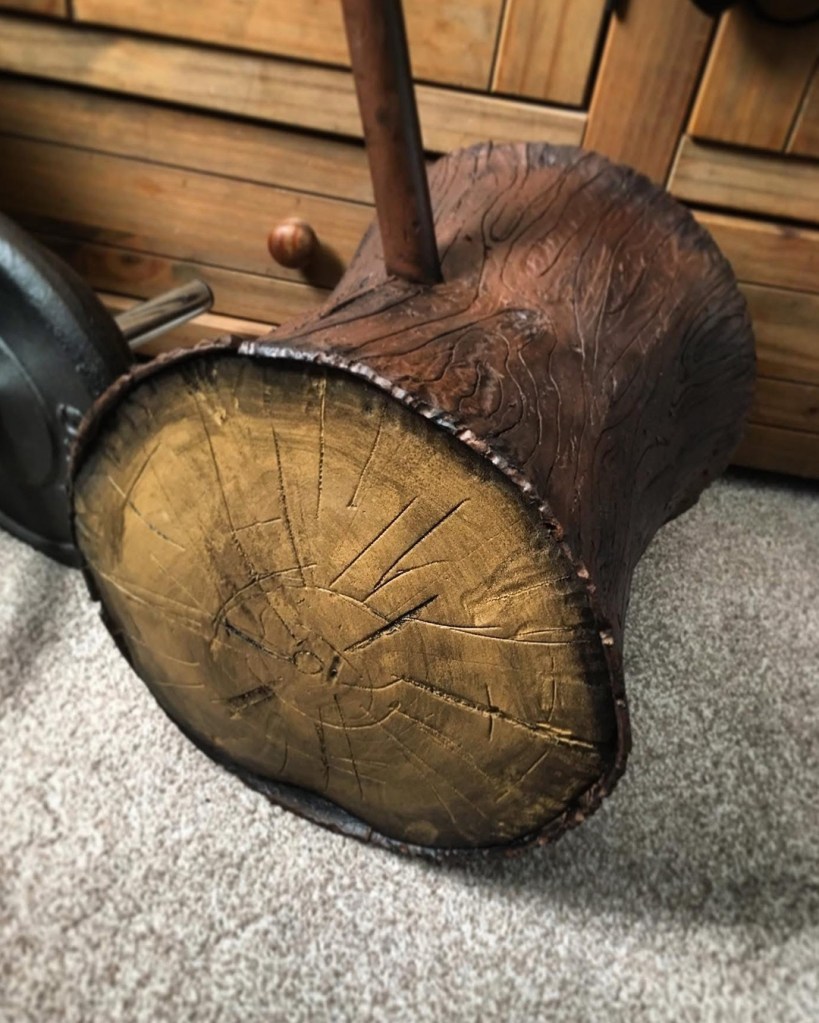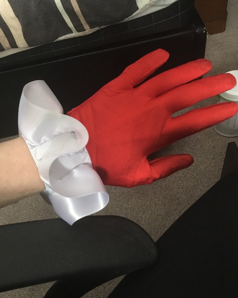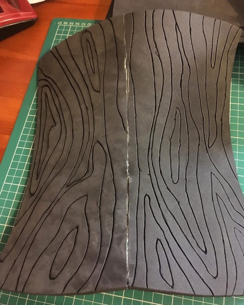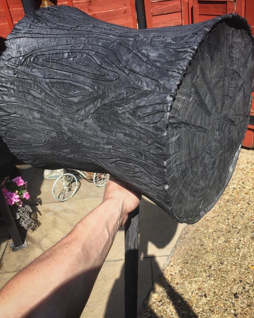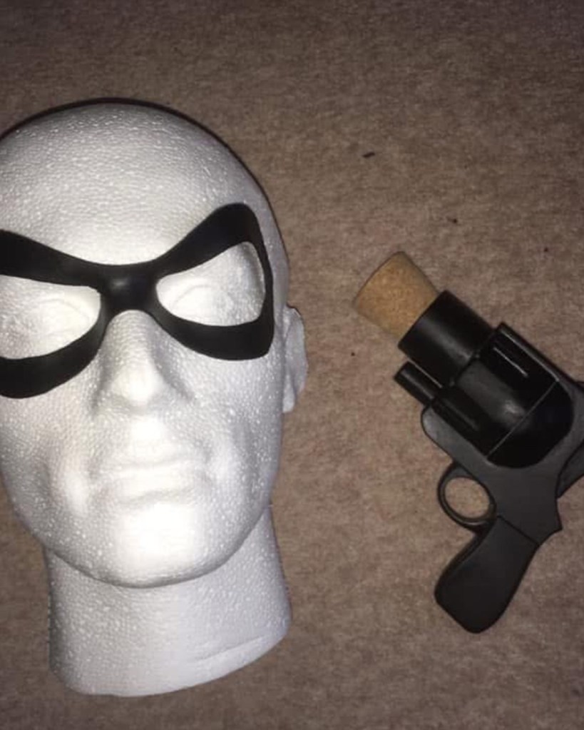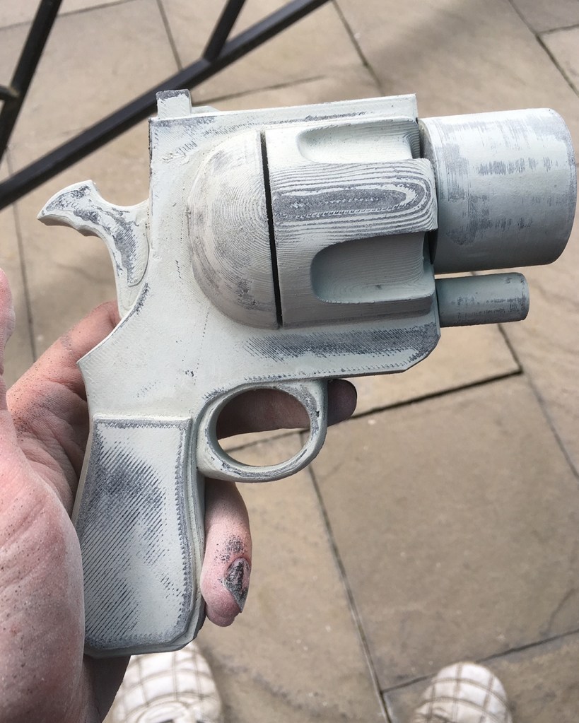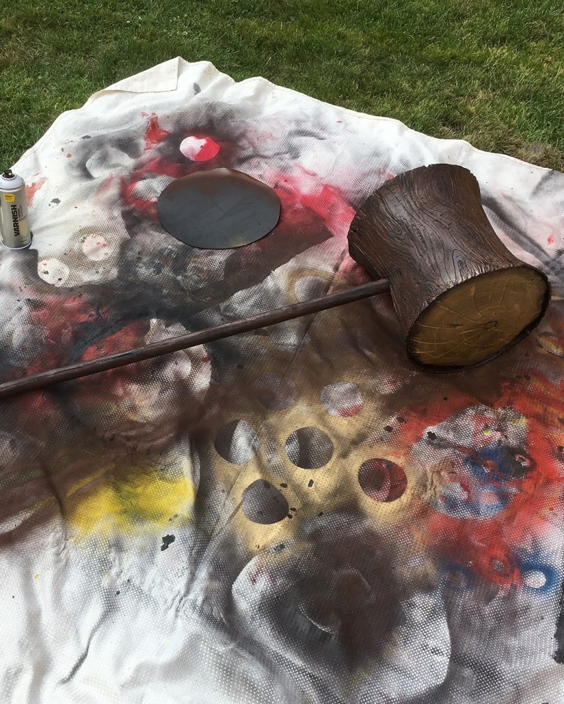 For this cosplay, I painted the shoes, made the wrist cuffs (out of white elastic and white ribbon), the mask (using worbla and elastic) and the mallet. The mallet was a proud build of mine. The mallet is entirely EVA foam (with a ventilation pipe for the handle). I packed out the main part in bubble wrap so it wasn’t hollow, but was still lightweight. I used a soldering iron and dremel to make the mallet look like a wooden stump. For my other jester Harley I had previously made a cartoon bomb and Joker cards. When I upgraded to this, Icarus1UK 3D printed me a new Batman: The Animated Series – Harley Quinn pop gun.