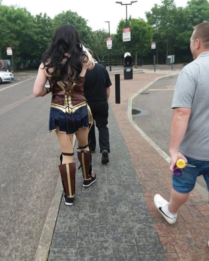 By this point of the Comic-Con I had lost my friends. But, I remembered what the people on Squad UK told me, so I attended their meet. I was walking around outside searching, I got stopped by a few people who took photos (some even recognized me from my posts online) and I made my way through a sea of people. My feet were hurting, my shoulders were hurting, my gauntlets of my costume had a funny reaction to my skin on my forearms (causing them to burn). I was in pain, tired, over-stimulated and it suddenly dawned on me how much I was out of my comfort zone. Then I began remembering what some friends and family said about me being Wonder Woman and my anxiety built up. Moreover, by this point of my life, I had not overcome any of my social anxiety yet. I must have appeared like a lost lamb, but my friend BadPanda_Ig (and her partner of the time) found me and introduced me to everyone. Fundamentally, I was a stranger to them on this first meeting, but they still dropped what they were doing to make time for me and introduce me to everyone. During this point I must have said no more than five words. I was even introduced to nparkerphotos, who took some photos of me. Everyone was super lovely. I felt a little like an imposter though.