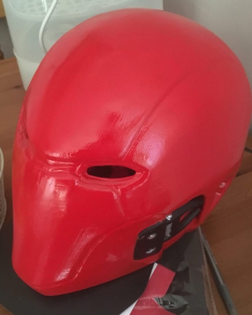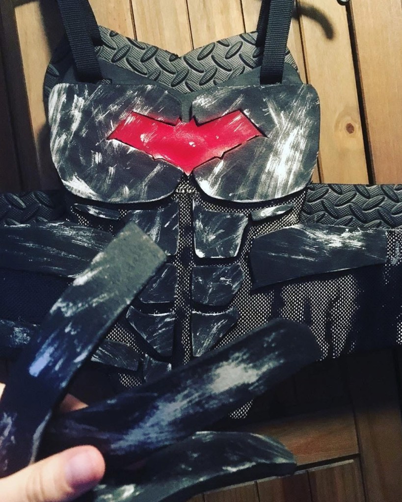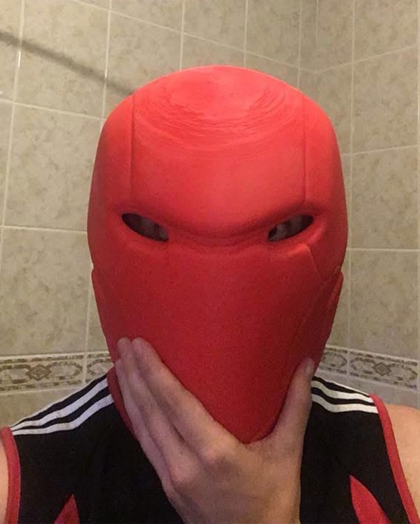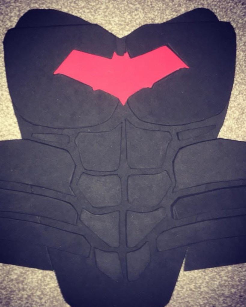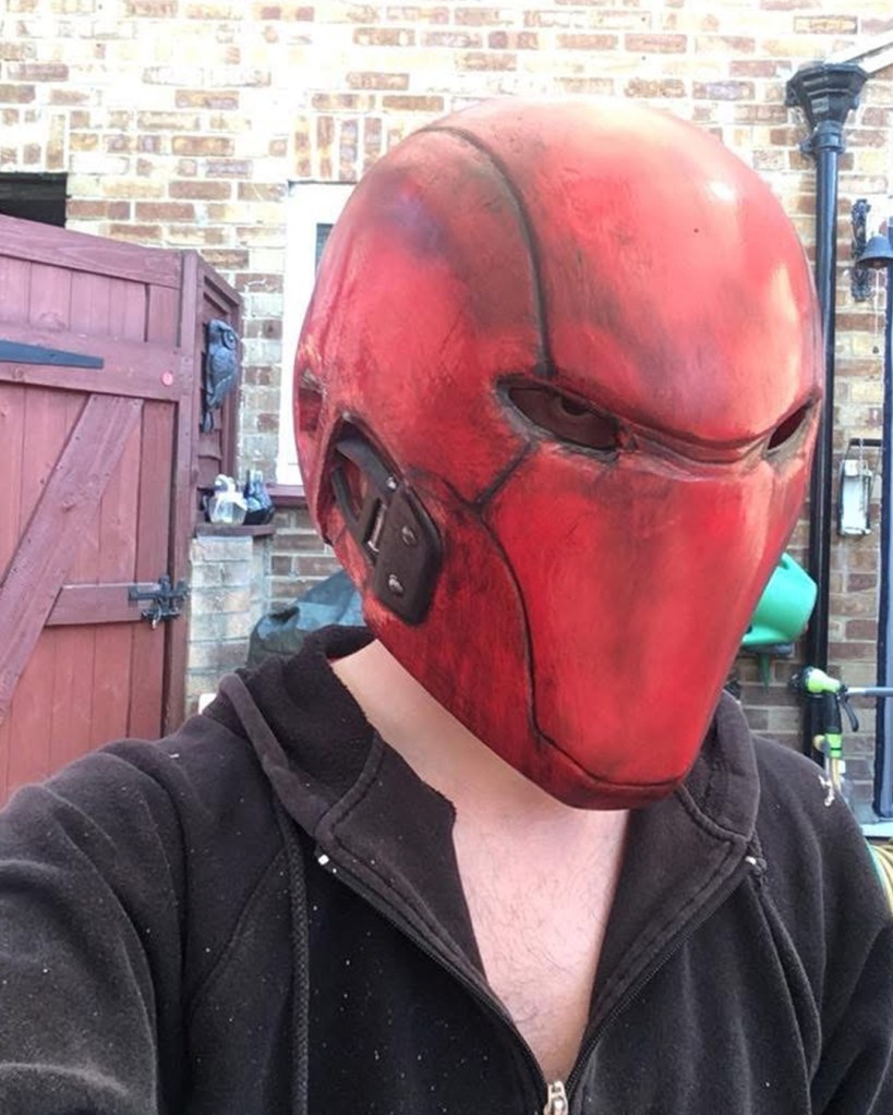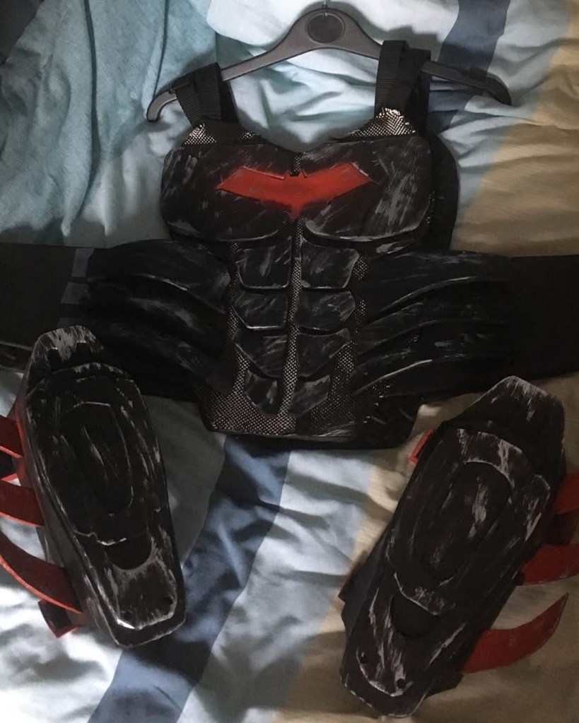 I initially sewed a red emblem onto a tight fitted shirt, spray painted an “army of two” mask and wore an old bomber jacket with added motocross armour. Upon my second year of cosplay I used EVA foam for the first time. I started off by designing armour on Adobe Illustrator, sizing it up for print and assembling. I then put the pieces together. I spoke to a Nightwing cosplayer at a SQUAD UK meet who gave me advice on the texture, regarding using carbon fibre with the armour. I took inspiration from many Batman armour designs and plated the emblem within the chest pieces. I also used patterns for the Arkham City design to make boot covers and gauntlets. I used worbla to make the under mask and I cut up an old hoody for the red hood. The helmet 2.0, a friend recorded a scale of my head (with a PlayStation EyeToy) and then digitally designed the Injustice 2 helmet around my head. He then 3D printed it for me, he accidentally knocked the plates during printing though and I had to save up to pay him again to replace the filament. This caused a slight set back. It was also, unfortunately, scaled too big. Which I appreciate the thought because too big can be adjusted, whereas too small; there’s nothing that can be done. Therefore, I had to add foam insulation inside to keep it in place. I got the helmet as a raw print, so I used wood filler and various tools to sand and smooth out the helmet. I had to drill holes for the eyes and then use fibreglass resin to seal the outer layer (I now know better with 3D prints, nowadays I use filler spray and sanding). The final touch was painting it. It was far too vibrant and clean, so I used black acrylic paint and kept washing it off. I also used this technique with my foam armour. For the eyes I used wired mesh which I painted white and hot glued that inside.