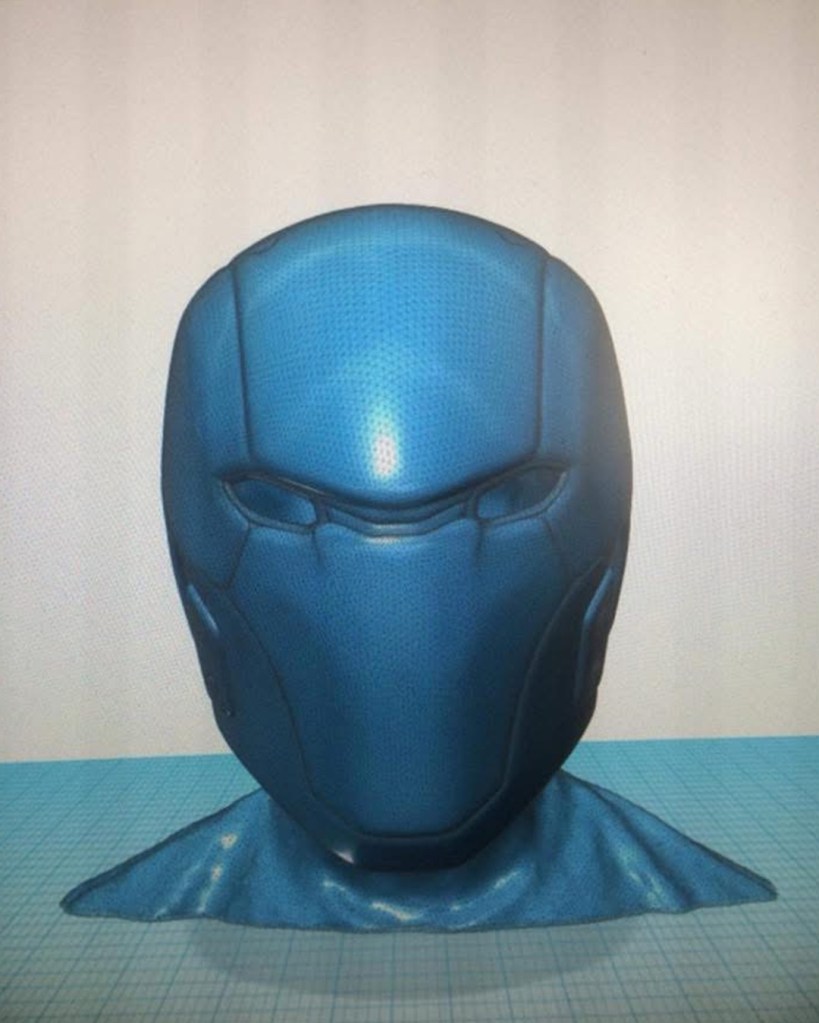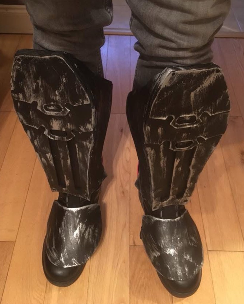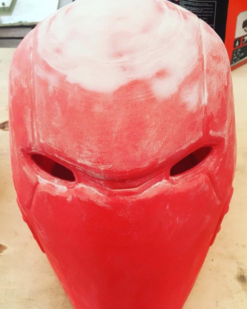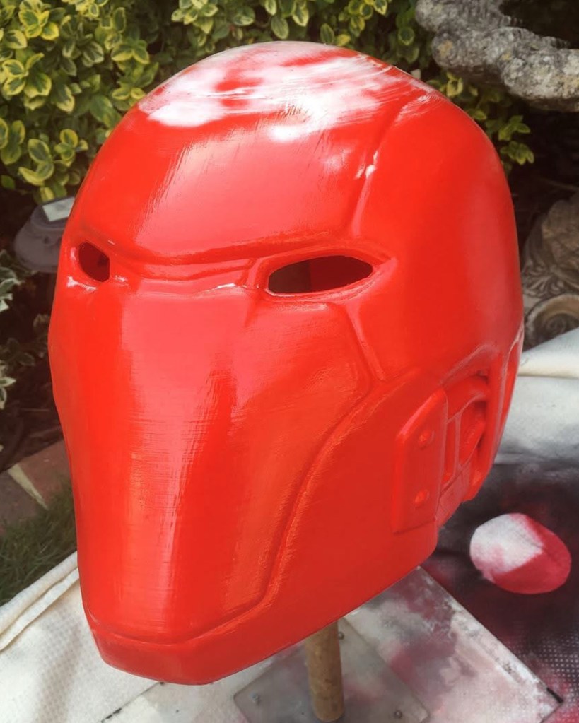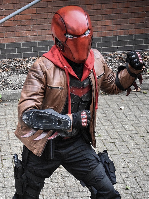 I initially sewed a red emblem onto a tight fitted shirt, spray painted an “army of two” mask and wore an old bomber jacket with added motocross armour. Upon my second year of cosplay I used EVA foam for the first time. I started off by designing armour on Adobe Illustrator, sizing it up for print and assembling. I then put the pieces together. I spoke to a Nightwing cosplayer at a SQUAD UK meet who gave me advice on the texture, regarding using carbon fibre with the armour. I took inspiration from many Batman armour designs and plated the emblem within the chest pieces. I also used patterns for the Arkham City design to make boot covers and gauntlets. I used worbla to make the under mask and I cut up an old hoody for the red hood. The helmet 2.0, a friend recorded a scale of my head (with a PlayStation EyeToy) and then digitally designed the Injustice 2 helmet around my head. He then 3D printed it for me, he accidentally knocked the plates during printing though and I had to save up to pay him again to replace the filament. This caused a slight set back. It was also, unfortunately, scaled too big. Which I appreciate the thought because too big can be adjusted, whereas too small; there’s nothing that can be done. Therefore, I had to add foam insulation inside to keep it in place. I got the helmet as a raw print, so I used wood filler and various tools to sand and smooth out the helmet. I had to drill holes for the eyes and then use fibreglass resin to seal the outer layer (I now know better with 3D prints, nowadays I use filler spray and sanding). The final touch was painting it. It was far too vibrant and clean, so I used black acrylic paint and kept washing it off. I also used this technique with my foam armour. For the eyes I used wired mesh which I painted white and hot glued that inside.