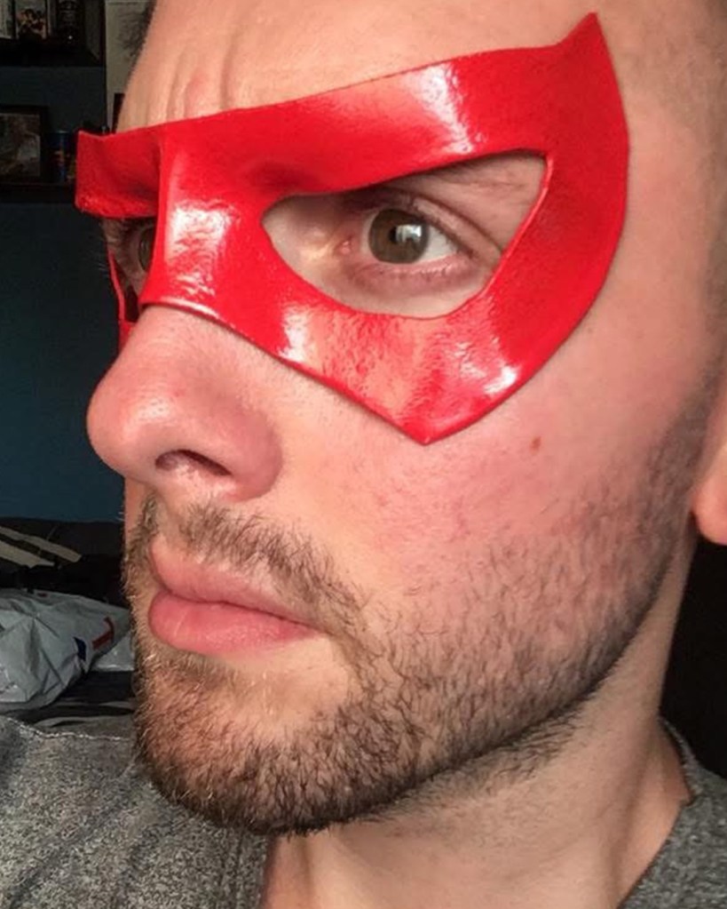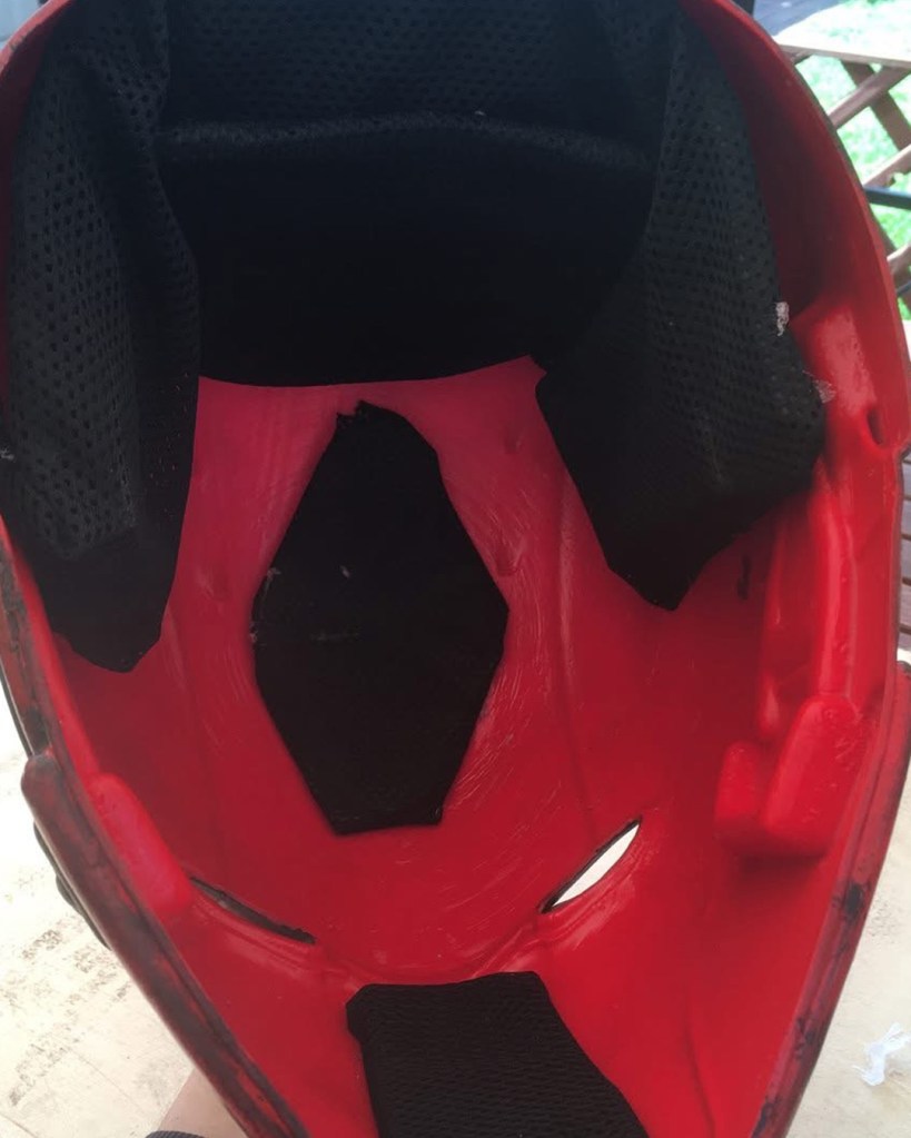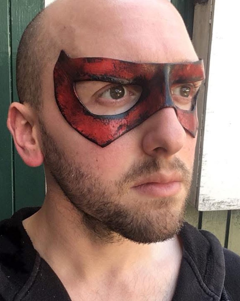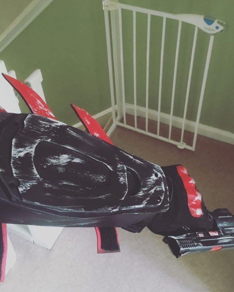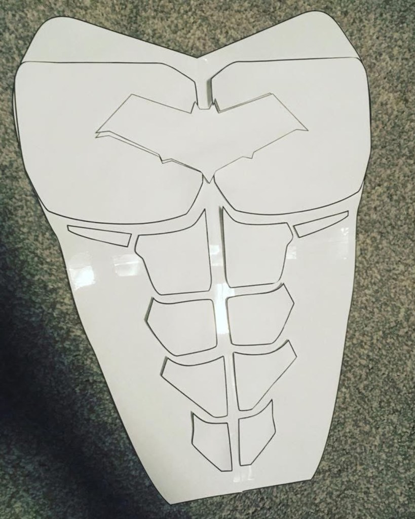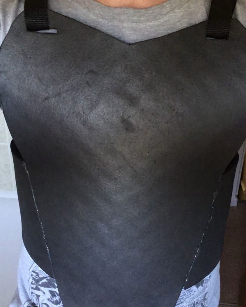 I initially sewed a red emblem onto a tight fitted shirt, spray painted an “army of two” mask and wore an old bomber jacket with added motocross armour. Upon my second year of cosplay I used EVA foam for the first time. I started off by designing armour on Adobe Illustrator, sizing it up for print and assembling. I then put the pieces together. I spoke to a Nightwing cosplayer at a SQUAD UK meet who gave me advice on the texture, regarding using carbon fibre with the armour. I took inspiration from many Batman armour designs and plated the emblem within the chest pieces. I also used patterns for the Arkham City design to make boot covers and gauntlets. I used worbla to make the under mask and I cut up an old hoody for the red hood. The helmet 2.0, a friend recorded a scale of my head (with a PlayStation EyeToy) and then digitally designed the Injustice 2 helmet around my head. He then 3D printed it for me, he accidentally knocked the plates during printing though and I had to save up to pay him again to replace the filament. This caused a slight set back. It was also, unfortunately, scaled too big. Which I appreciate the thought because too big can be adjusted, whereas too small; there’s nothing that can be done. Therefore, I had to add foam insulation inside to keep it in place. I got the helmet as a raw print, so I used wood filler and various tools to sand and smooth out the helmet. I had to drill holes for the eyes and then use fibreglass resin to seal the outer layer (I now know better with 3D prints, nowadays I use filler spray and sanding). The final touch was painting it. It was far too vibrant and clean, so I used black acrylic paint and kept washing it off. I also used this technique with my foam armour. For the eyes I used wired mesh which I painted white and hot glued that inside.